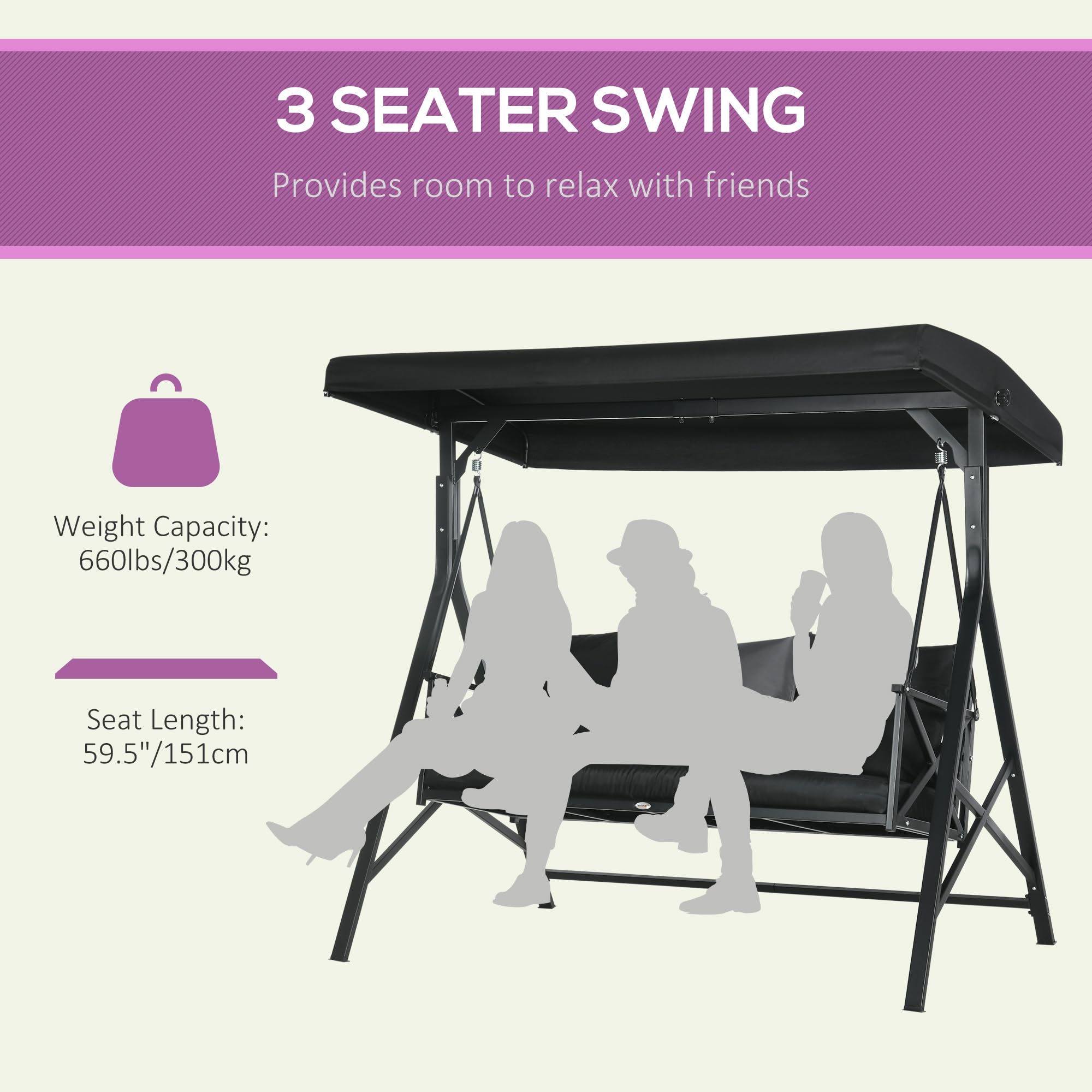 - Seats Three Adults: With a 660 lbs. weight capacity and 59.5" seat length, our porch swing offers outdoor seating for all sorts of occasions, whether it's campfires, cookouts, or a cozy Saturday. With room for three people, step out into the sunlight and enjoy the fresh air together.