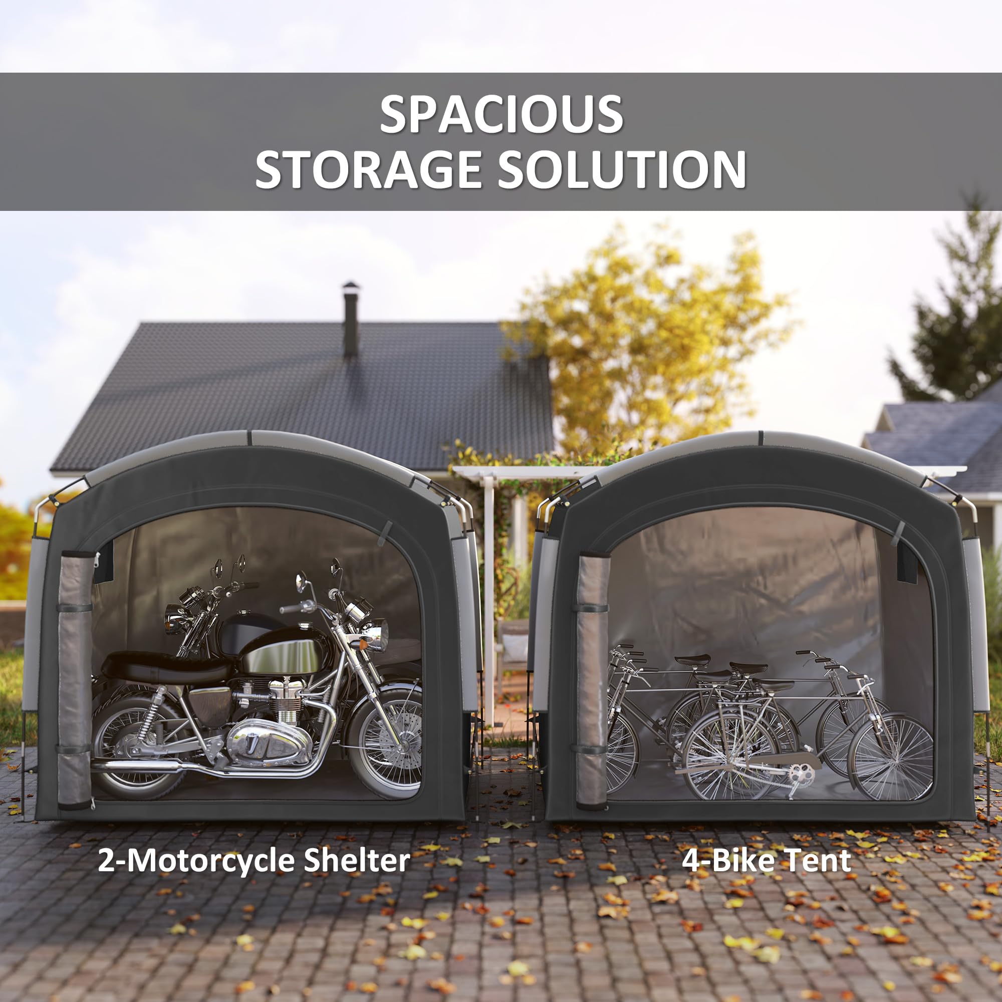 - Spacious Storage Solution: This bike tent, with 80.7" x 55.1" x 74" inner space, comfortably fits four bikes or two motorcycles, you can also store garden tools and holiday decorations, making it a versatile addition to any outdoor space.